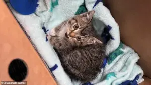 The kitten, which weighed about a pound, remains a mystery in terms of how it ended up stranded on the highway, though the troopers’ swift intervention likely saved its life.