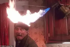 In one iconic scene, Harry is set ablaze by Kevin’s homemade flamethrower, a stunt that reportedly left actor Joe Pesci with ‘serious burns.’ In another, Marv endures four bricks thrown from a rooftop, writhing on the ground like a snake before rising unscathed. ‘Even if they appeared outwardly fine, the internal damage would probably be devastating,’ Taylor explains, emphasizing that the injuries depicted are not survivable in the real world.