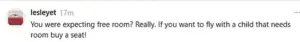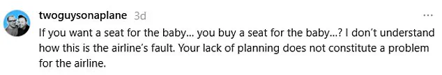 Your lack of planning does not constitute a problem for the airline.’ Others echoed similar sentiments, emphasizing that airlines are not responsible for passengers’ decisions to book under lap child policies without ensuring sufficient space for all family members.