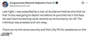 Frost, who has Puerto Rican and Haitian heritage, described the attack in a statement on X (formerly Twitter), recounting how a drunken man spewed racist remarks before striking him in the face. ‘Last night, I was assaulted by a man at Sundance Festival who told me that Trump was going to deport me before he punched me in the face,’ Frost wrote. ‘He was heard screaming racist remarks as he drunkenly ran off.