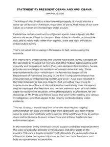 Former President Barack Obama has made a rare and forceful political statement condemning the Trump administration over the fatal shootings of two U.S. citizens by immigration officers in Minnesota.