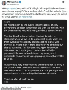 Pretti was fatally shot by a Border Patrol agent on January 24. Tim Cook called for ‘de-escalation’ in Minnesota following the incident