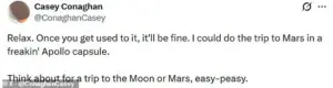 I could do the trip to Mars in a freakin’ Apollo capsule.’ Another joked, ‘So NASA’s gonna put Fitbits on the astronauts?