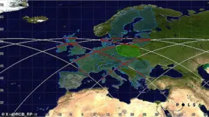 As the rocket re-enters the atmosphere, there is an extremely slim chance that it could fall over Northern Scotland or Ireland. However, it is more likely to fall into the sea or burn up in the atmosphere. Pictured: Possible landing trajectories predicted by the Polish Space Agency