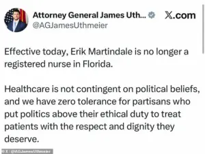 The controversy escalated when Florida Attorney General James Uthmeier announced on Thursday that Martindale is no longer a registered nurse in Florida. “Healthcare is not contingent on political beliefs, and we have zero tolerance for partisans who put politics above their ethical duty to treat patients with the respect and dignity they deserve,” Uthmeier said in a statement.