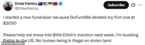 An Australian political activist has ignited a global debate with a bold campaign to occupy Billie Eilish’s $3 million California mansion, a home now at the center of a cultural and legal storm. Drew Pavlou, a 26-year-old advocate for Indigenous rights, launched a GoFundMe to raise money for a flight to the United States, aiming to set up camp on the singer’s driveway and live rent-free for months. His initial fundraiser, which sought to fund the journey, garnered $3,000 before being abruptly removed. Undeterred, Pavlou shifted his efforts to the platform GiveSendGo, where he successfully secured enough money for airfare. In a statement on social media, he declared his intent to ‘set up a tent on the footpath outside Billie Eilish’s mansion,’ echoing her words from the Grammy Awards: ‘No human being is illegal on stolen land.’