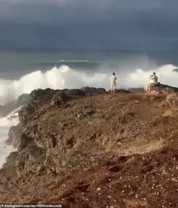A group of selfie-taking tourists in the Canary Islands narrowly escaped death after a monstrous wave struck them during a storm near the Faro de Sardina del Norte in Gran Canaria. Footage captured the moment the tourists, ignoring warning signs, stood on a rocky ledge overlooking the ocean. The cliffs here drop over 66 feet, and protective fencing was in place to keep people safe. Yet the group breached the barriers, cameras in hand, as waves crashed violently ahead of them. One man stood motionless, staring at the churning waters, while a woman sat nearby, filming the scene. Their complacency lasted only moments before a towering wave surged forward, drenching them in cold water and forcing them to flee to higher ground. The impact of the wave sent shockwaves through the group, amplifying fears among those who had ignored the risks. Canarias 1500 Km de Costa, a local safety organization, reiterated the dangers of such behavior, emphasizing that this location is among the most hazardous on the island’s coastline. The incident underscores a recurring pattern of recklessness in high-risk areas, where tourists repeatedly defy warnings.