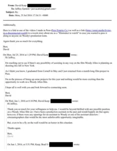 David Karp, now a creative director for a film production company, once sent Epstein 20 questions to secure a meeting with Allen. ‘This is truly a once-in-a-lifetime experience,’ he wrote. Epstein texted Allen about David in August 2016, noting, ‘He’s 22 and worked on Scorsese’s production of Vinyl. He will do anything and does not need to get paid.’ Allen responded with the number for his assistant, though he initially ignored the texts. After the meeting, David thanked Epstein, saying, ‘She’s going to put me in contact with the assistant directors… Thank you again for setting this up.’