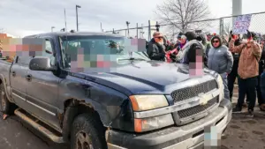 The protest, which was already tense, escalated further as a protester attempted to rip the ‘NUREMBERG 2.0’ sign from the truck driver’s hands. Another demonstrator, holding a sign that read ‘free hugs 4 immigrants and friends,’ was surrounded by dildos on the ground, adding to the surreal atmosphere. The Hennepin County Sheriff’s Office (HCSO) confirmed that 50 people were arrested at the scene, with 47 cited for unlawful assembly and seven booked into the county jail. The HCSO emphasized that while many protesters were acting peacefully, some individuals engaged in acts of violence, including damaging property and throwing ice chunks at law enforcement.