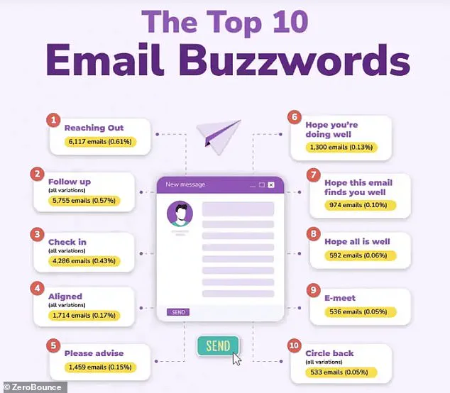 The team tallied specific buzzwords, as well as their close variations – for example, 'follow up' also included 'to follow up,' 'following up,' and 'will follow up.' Their analysis showed that around one in 50 emails include a buzzword. 'Reaching out' was the most common phrase, featuring in 0.61 per cent of all emails. 'Follow up' was next (0.57 per cent), followed by 'check in' (0.43 per cent), 'aligned' (0.17 per cent), 'please advise' (0.15 per cent), and 'hope you're doing well' (0.13 per cent).