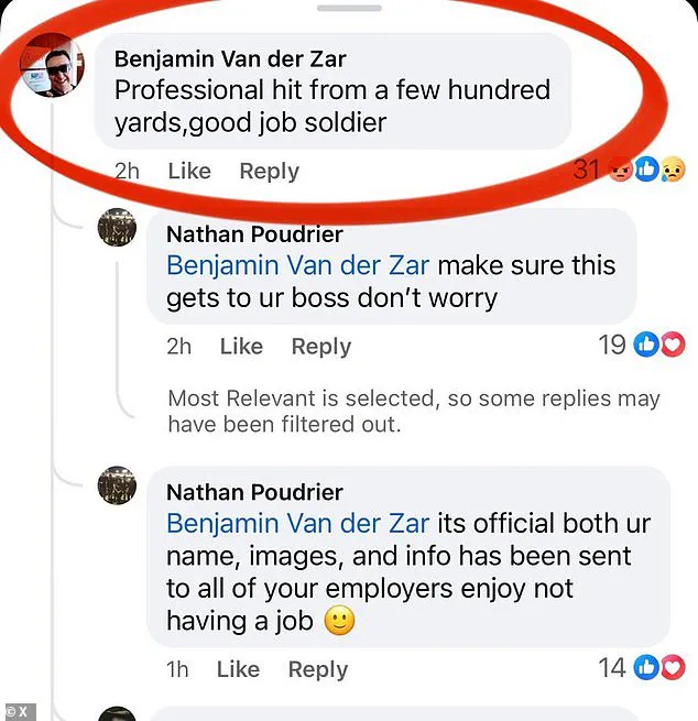 Benjamin Van der Zar commented on a post saying: 'Professional hit from a few hundred yards, good job soldier.' Kirk was speaking to students at the time and had mentioned transgender individuals being involved in mass shootings just seconds before he was assassinated.